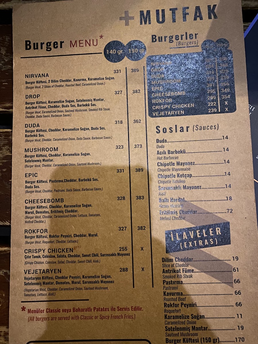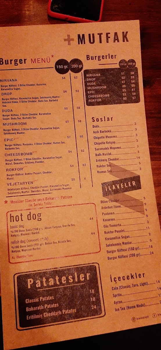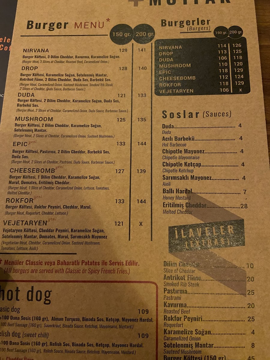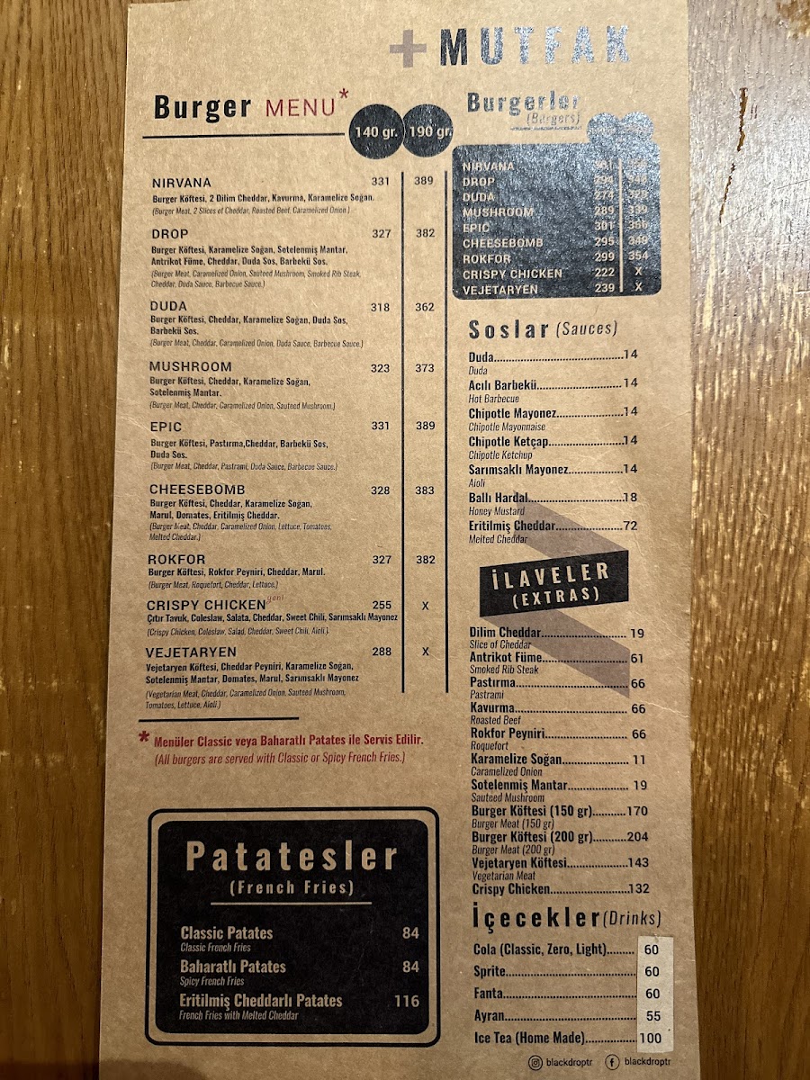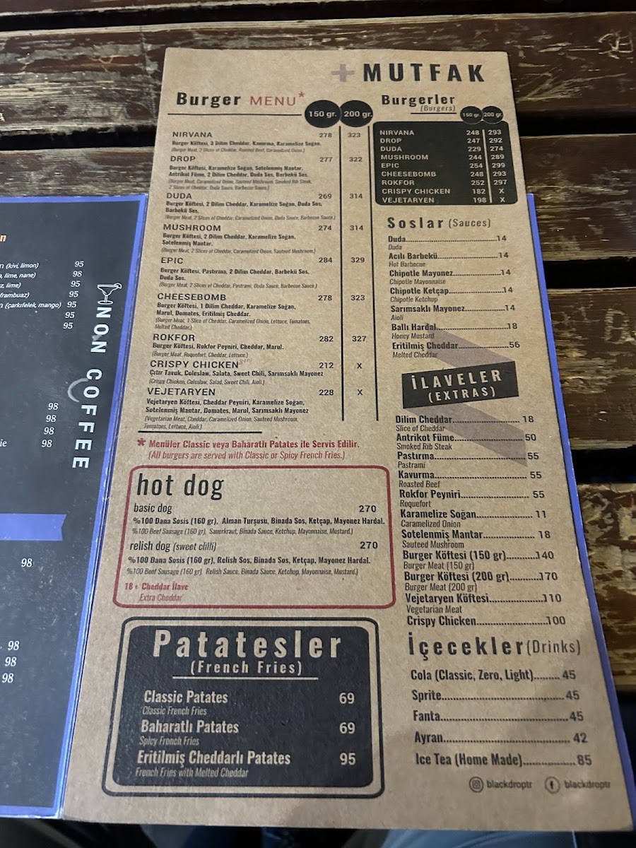 If you're in the mood for something a little more indulgent, the Roquefort Burger and Fries is a great choice, combining the richness of roquefort cheese with the satisfying crunch of fries. For a complete meal, the Drop Menü offers a variety of flavors that will leave you fully satisfied. The Eritilmiş Cheddar is another delightful option, bringing the creamy goodness of melted cheddar to your plate, perfect for cheese lovers. If you're looking for a unique dining experience, the Nitro Menü offers a creative twist on traditional dishes with a fascinating presentation. To finish off your meal, enjoy a cup of the classic Türk Kahvesi, which offers a rich and flavorful end to your visit.